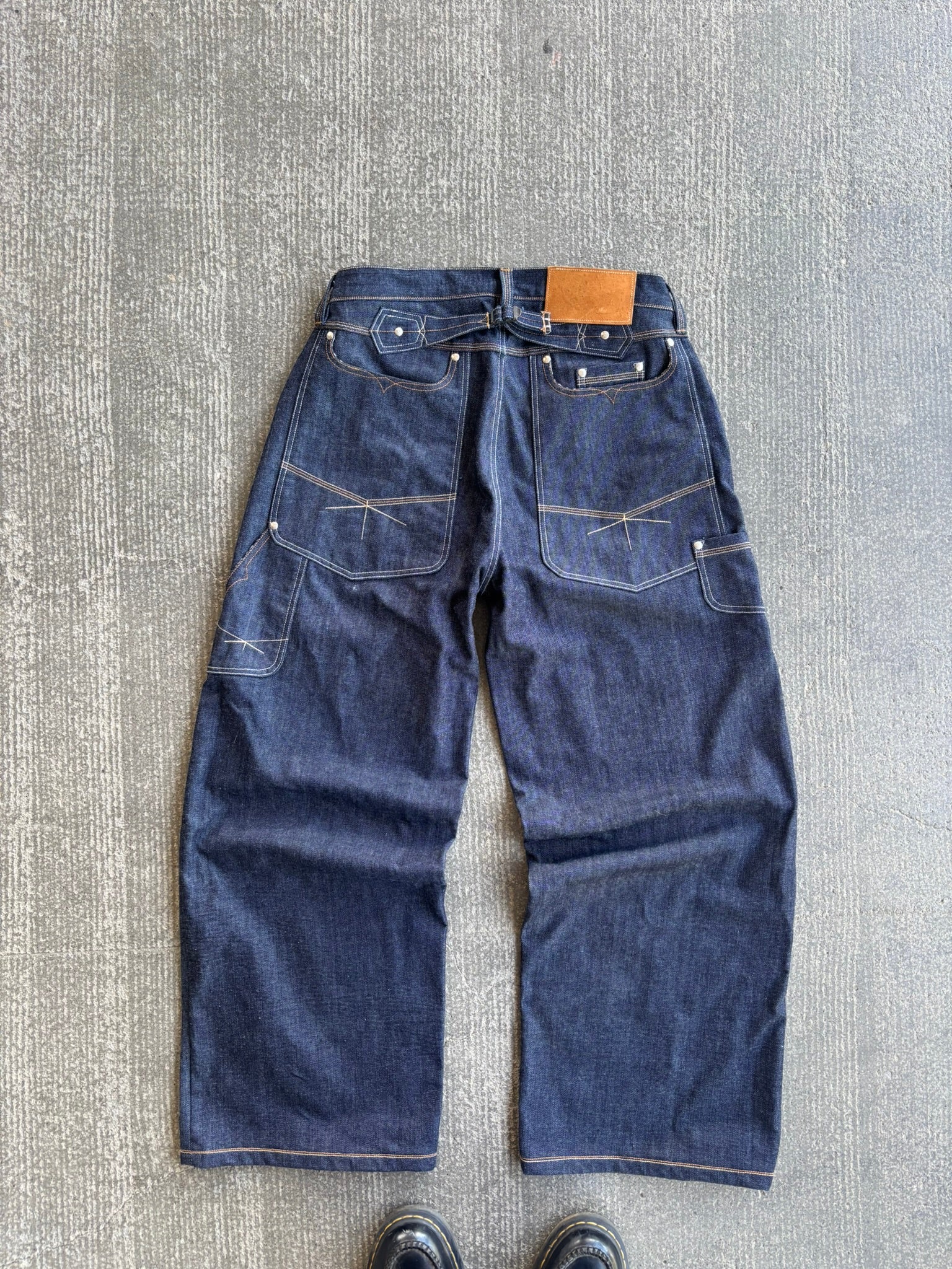A pair of jeans hand crafted to survive a lifetime of adventure. Created from a 13 Oz indigo raw denim, designed to fade with time and wear that tell your story. Pockets lined with a beautiful gingham check. Secured with metal rivets and buckles reused from vintage military garments.