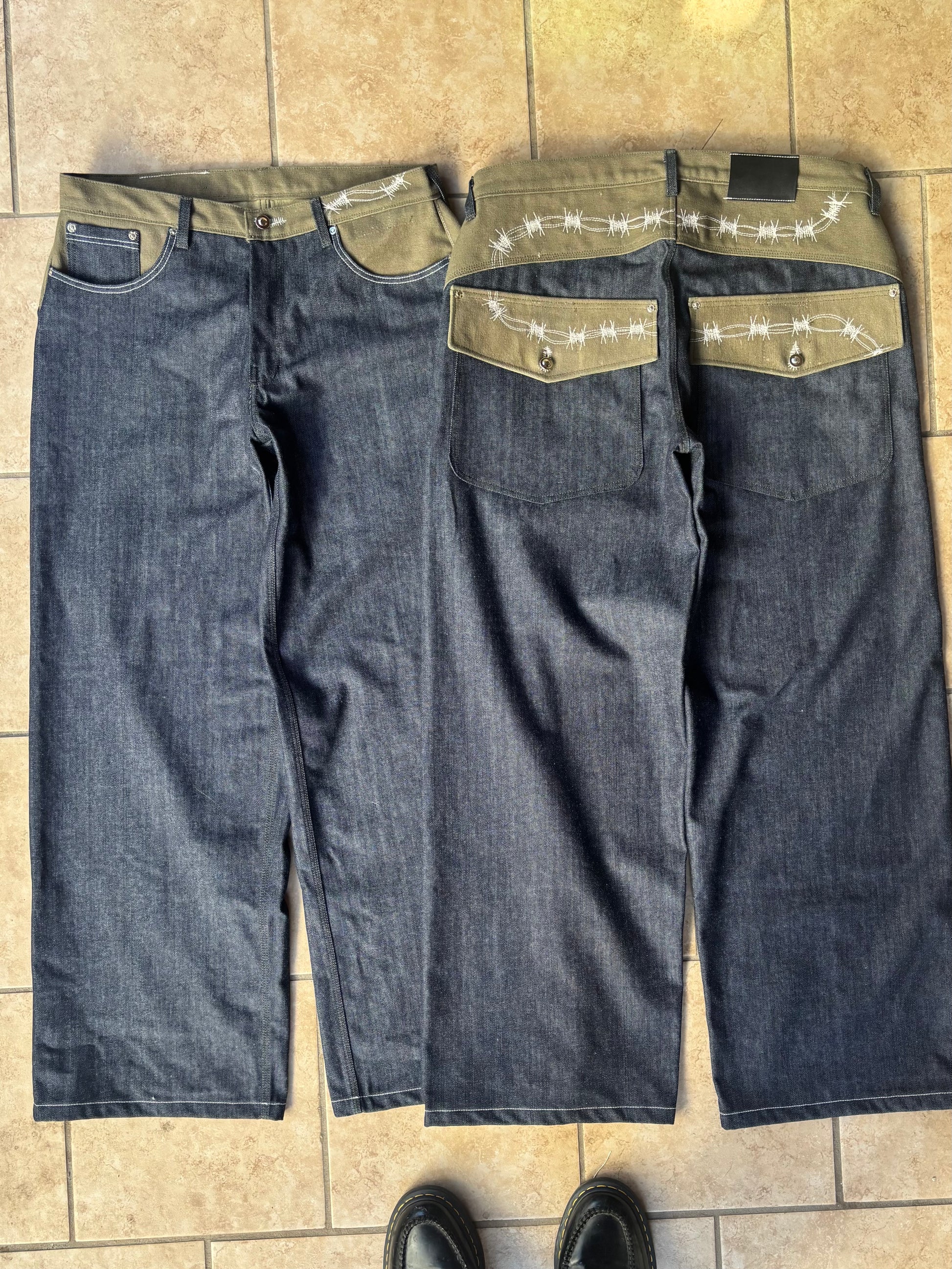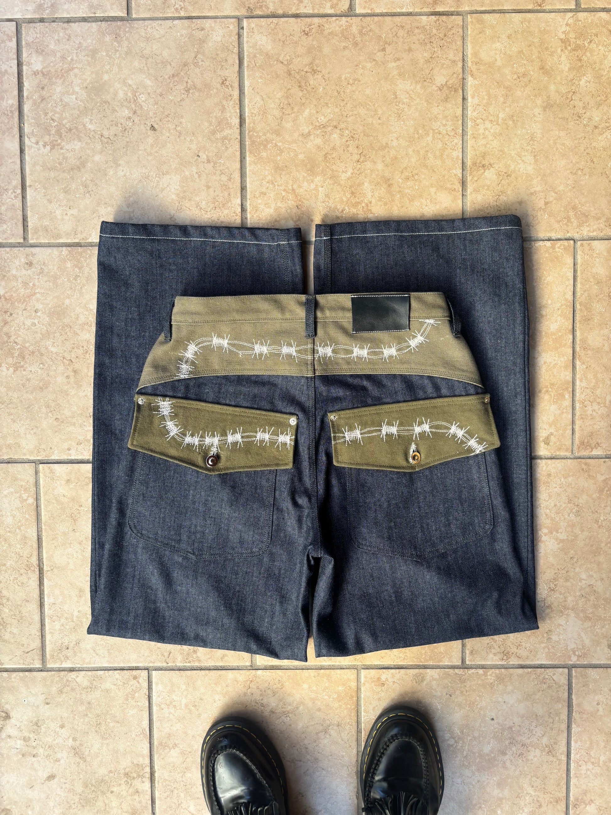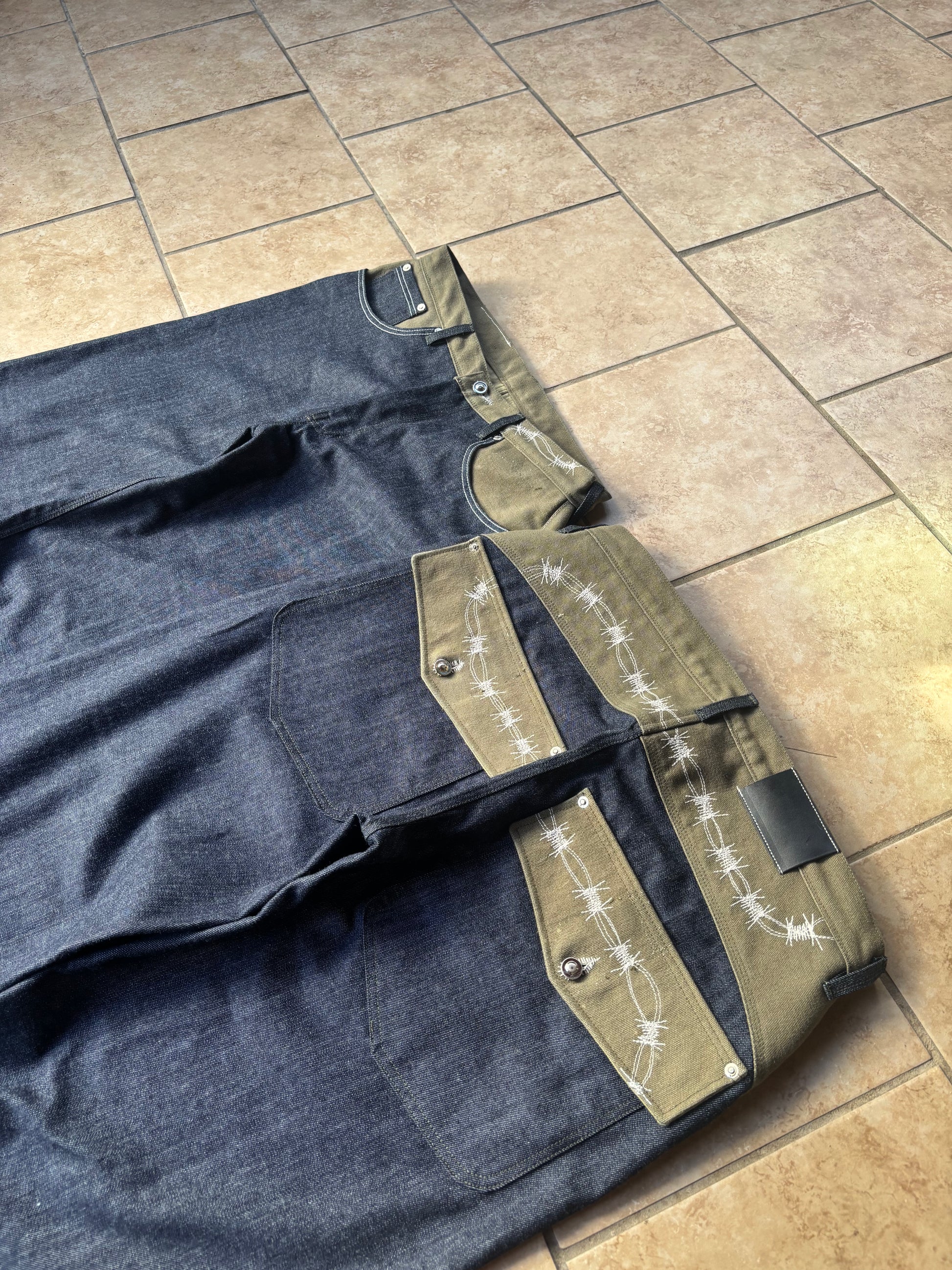 Constructed from a 12 oz denim and two vintage WW2 military duffle bag.